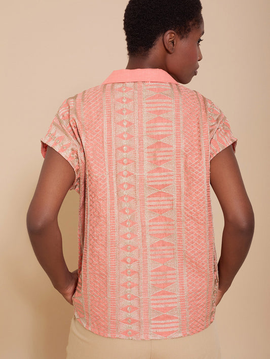 Blusa corallo con tessuto ricamato oro