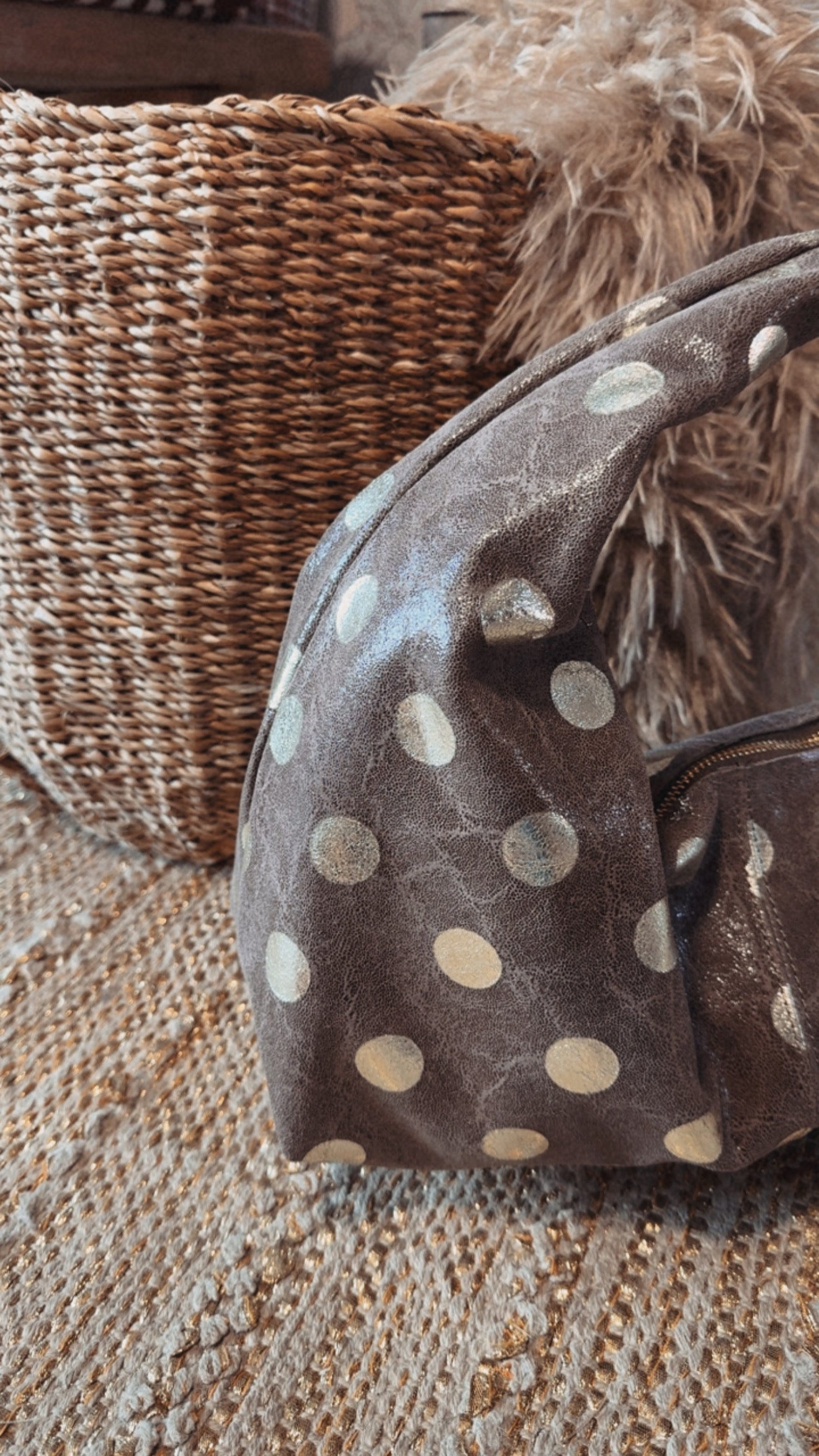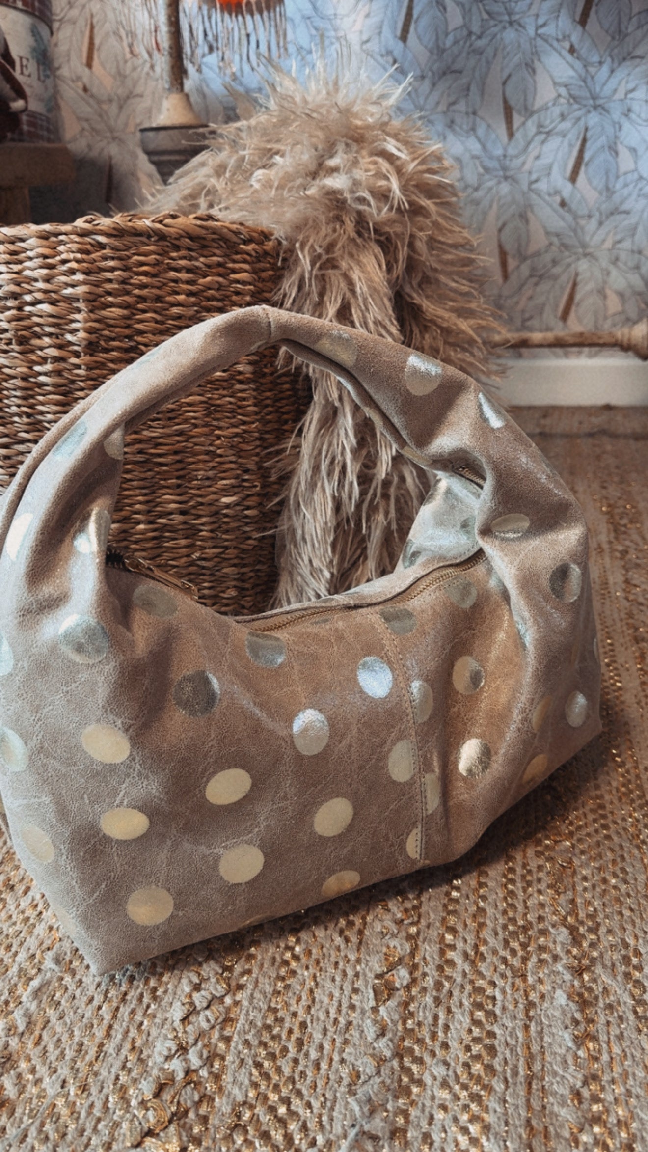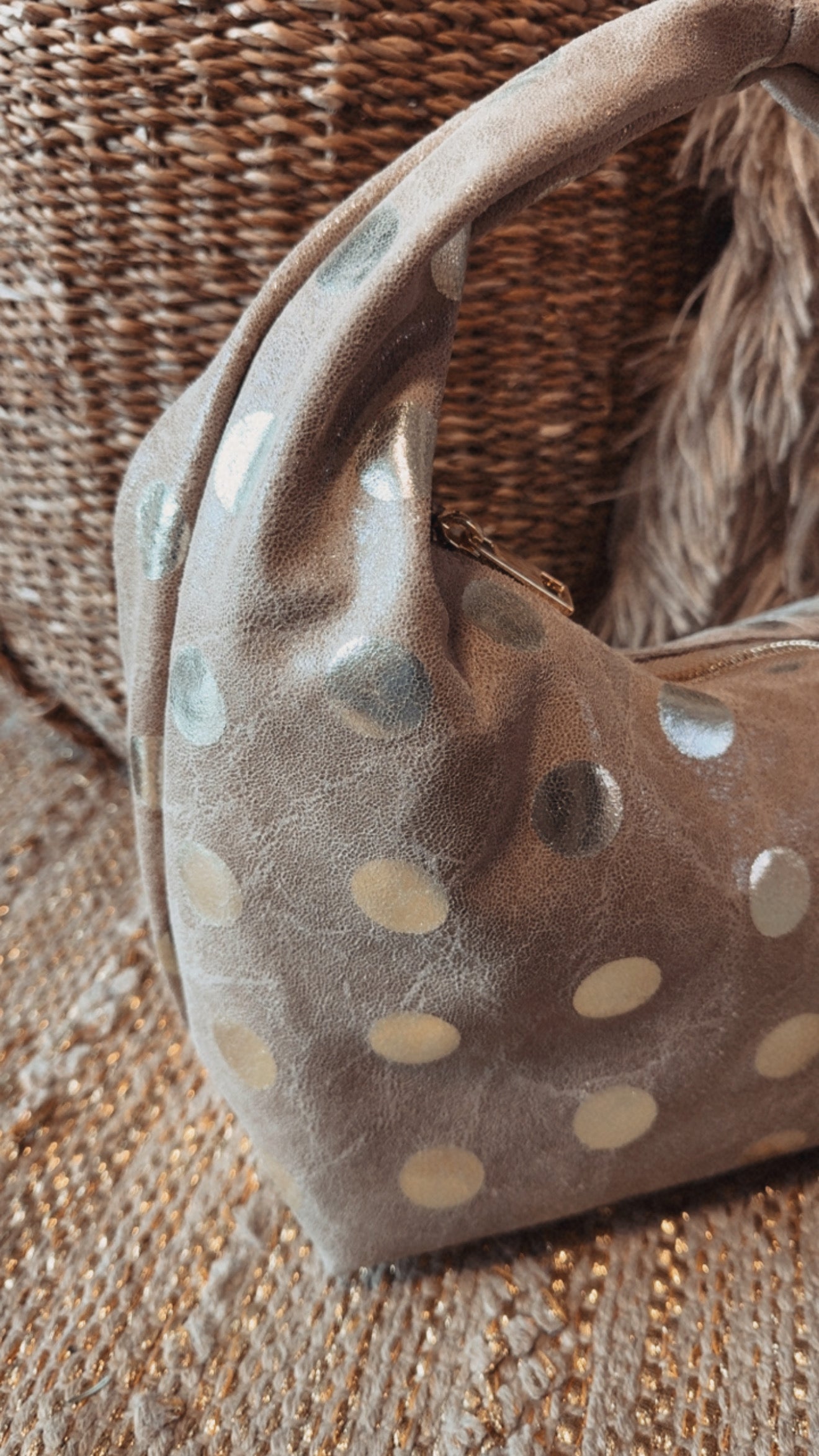 In vera pelle con patta laminata e bottone anticato ermetico.