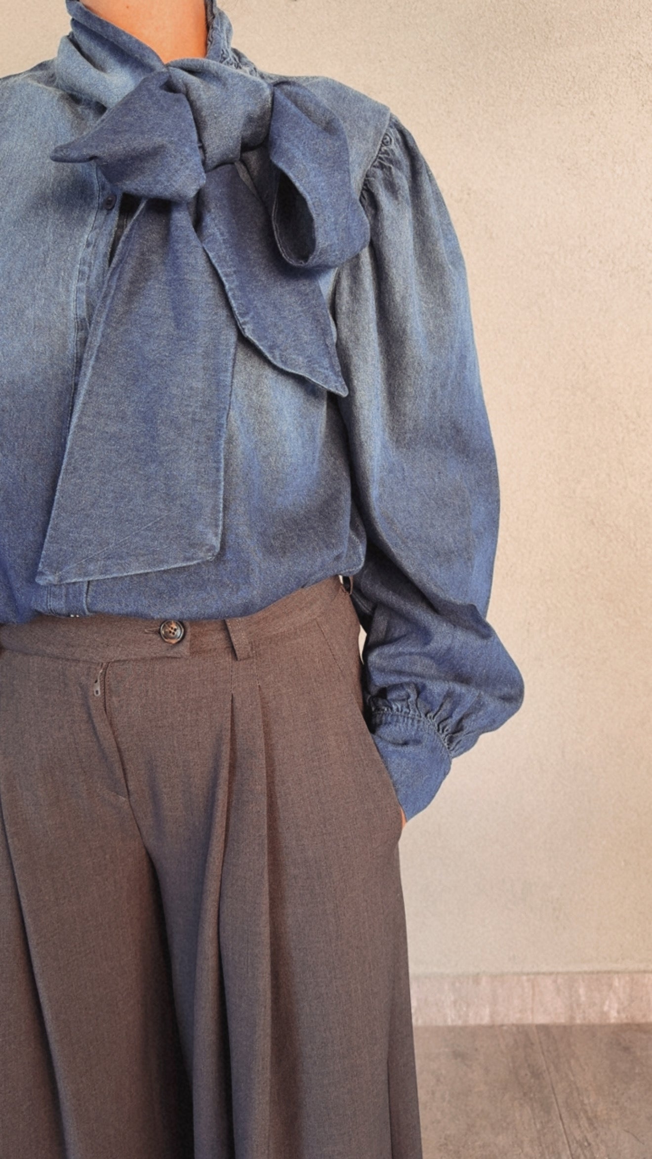 Collo alla coreana goffrato sul retro, con due bande di tessuto da annodare.