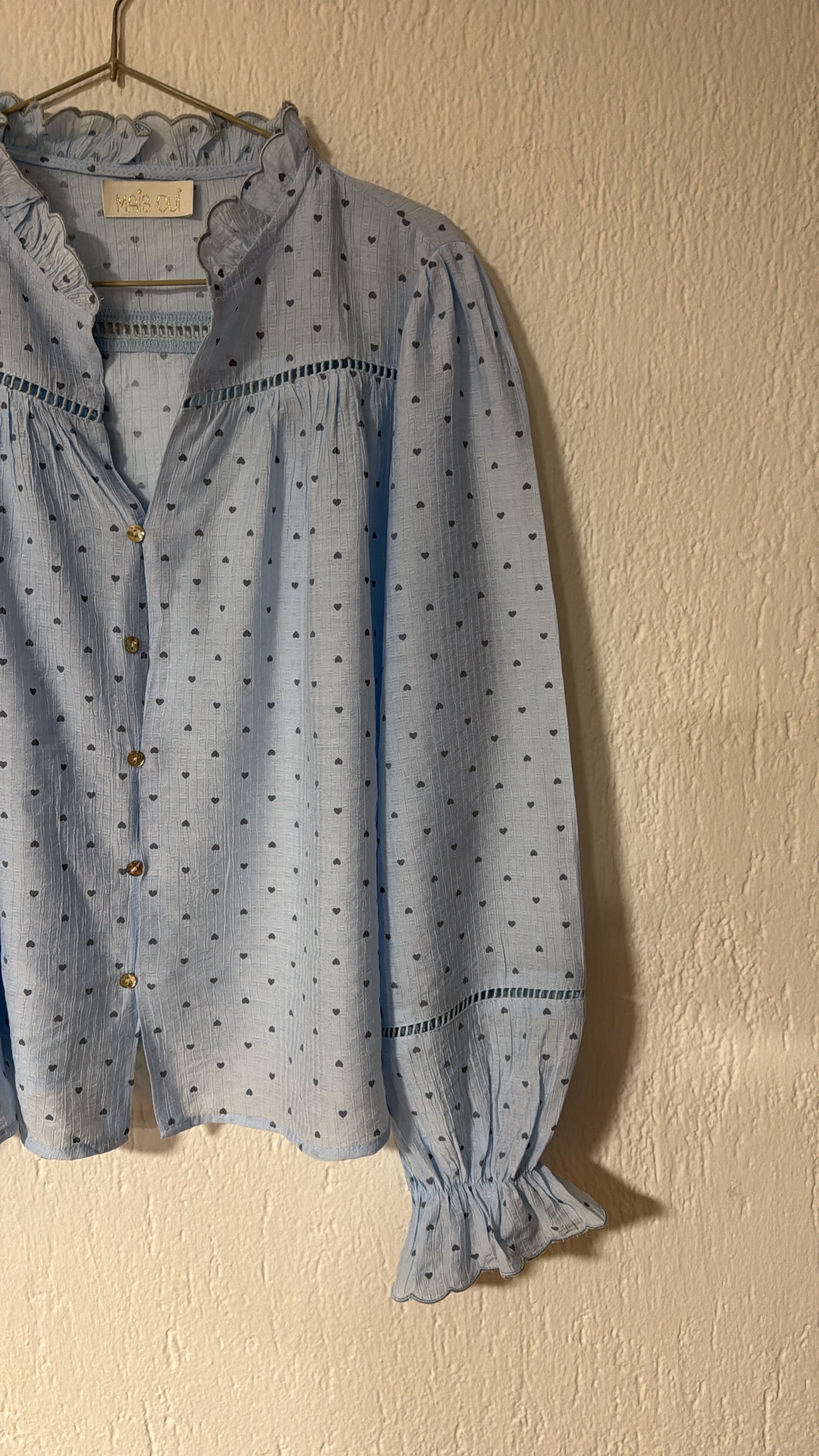 Modello romantico con colletto arricciato e chiusura frontale con bottoncini con asola elasticizzata.