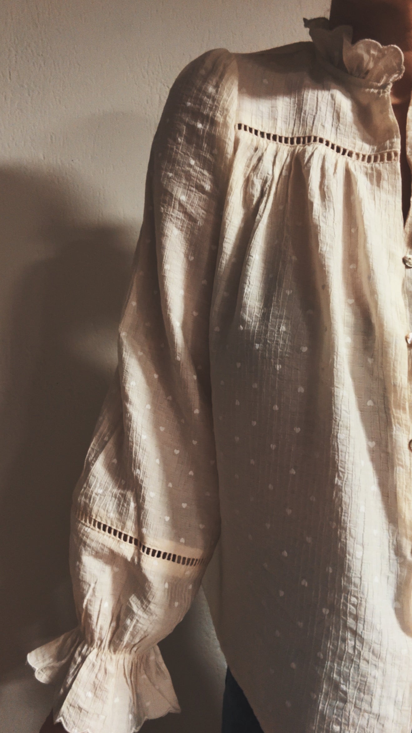 Modello romantico con colletto arricciato e chiusura frontale con bottoncini con asola elasticizzata.