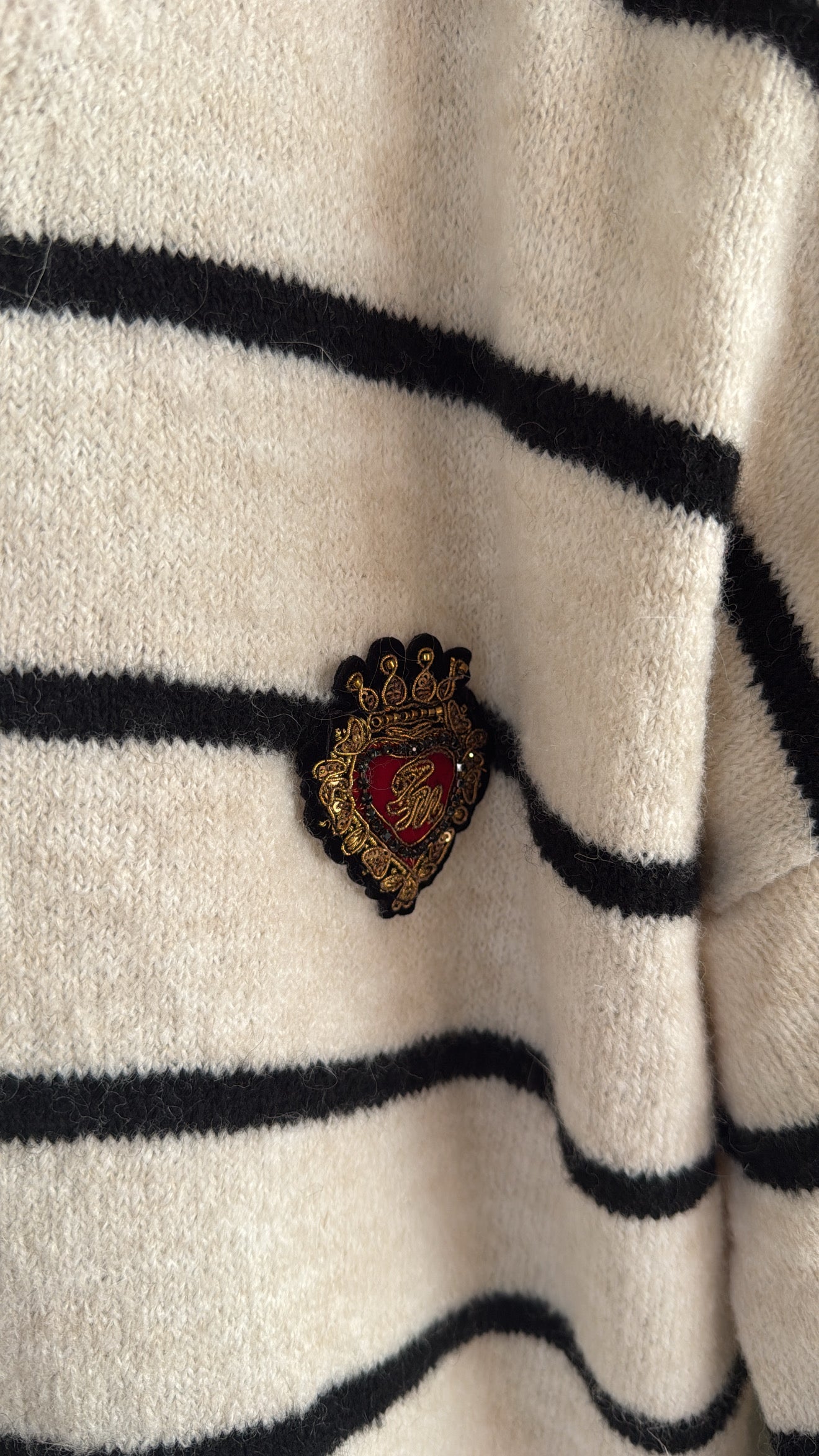 Questo cardigan in maglia gioca con il fascino collegiale delle righe ed è impreziosito con un piccolo cuore ricamato a mano con perline, simbolo di passione e unicità.