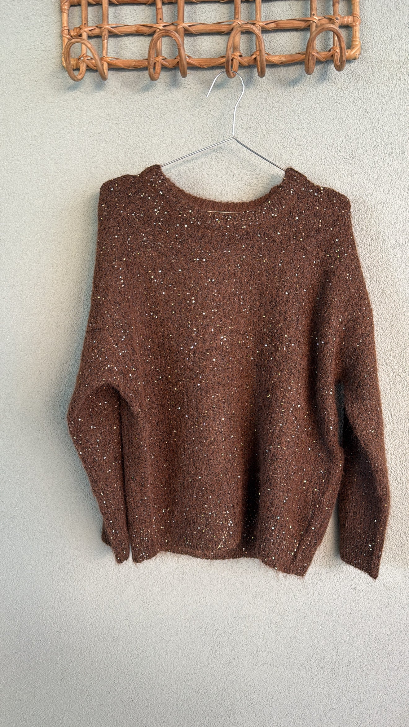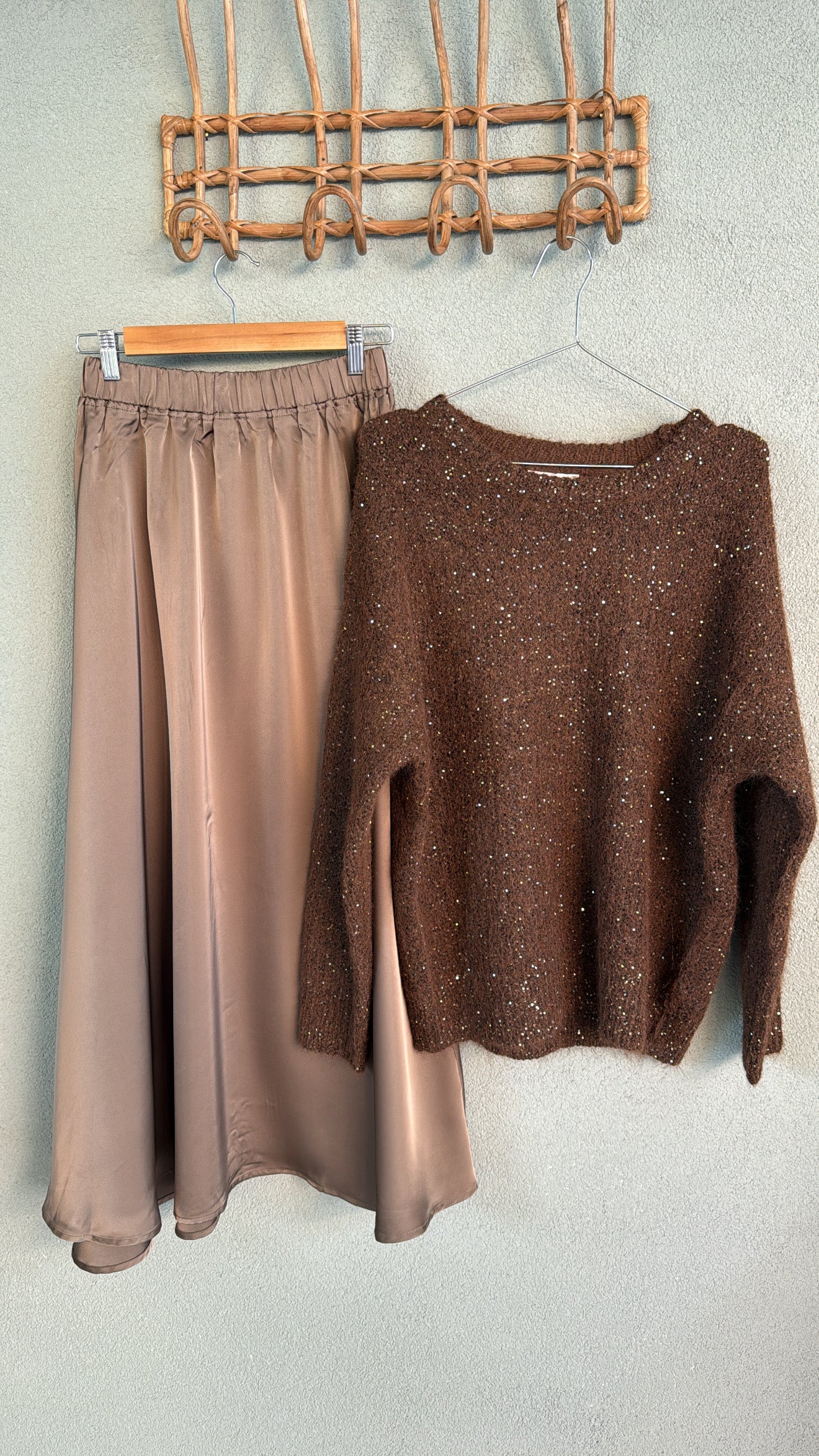 BRILLE: Brilla! Con indosso lei puoi farlo! Maglia girocollo con micro paillettes super brillanti. Disponibile in due varianti colore. Per un outfit super indossala con la gonna Annabel. Taglia unica. Composizione: 49% poliestere riciclato, 15% nylon, 5% lana, 2% spandex, 8% acrilico, 21% poliestere.