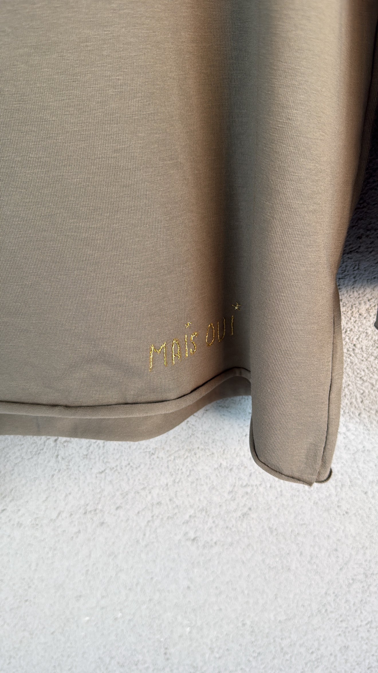 Manica lunga. Ricamo MAIS OUI in oro sul fondo. Vestibilità morbida, non gittata. Un basico che non può mancare nel guardaroba! Vestibilità taglia unica fino a 46. Composizione: 95% cotone, 5% elastane.