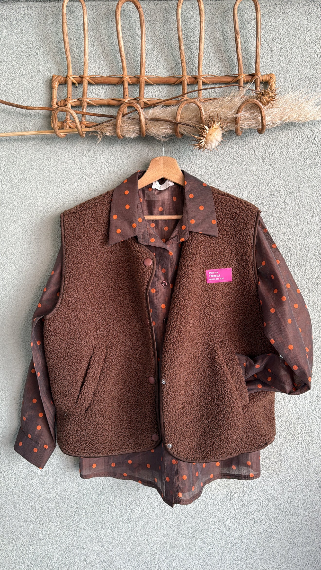 Woody: gilet teddy morbidissimo. Quattro bottoni ermetici. Targhetta in fucsia a sinistra. Taglia unica.