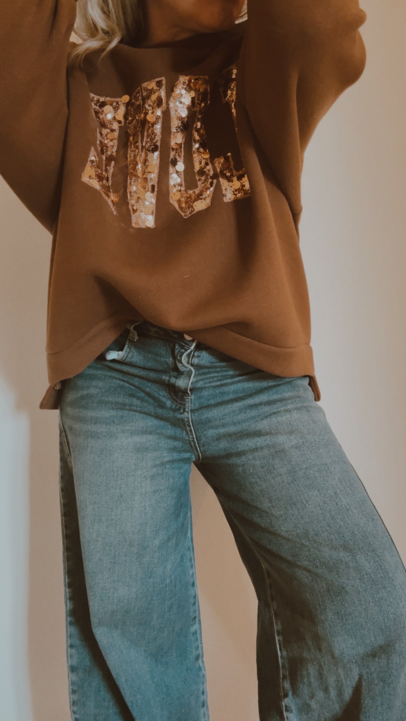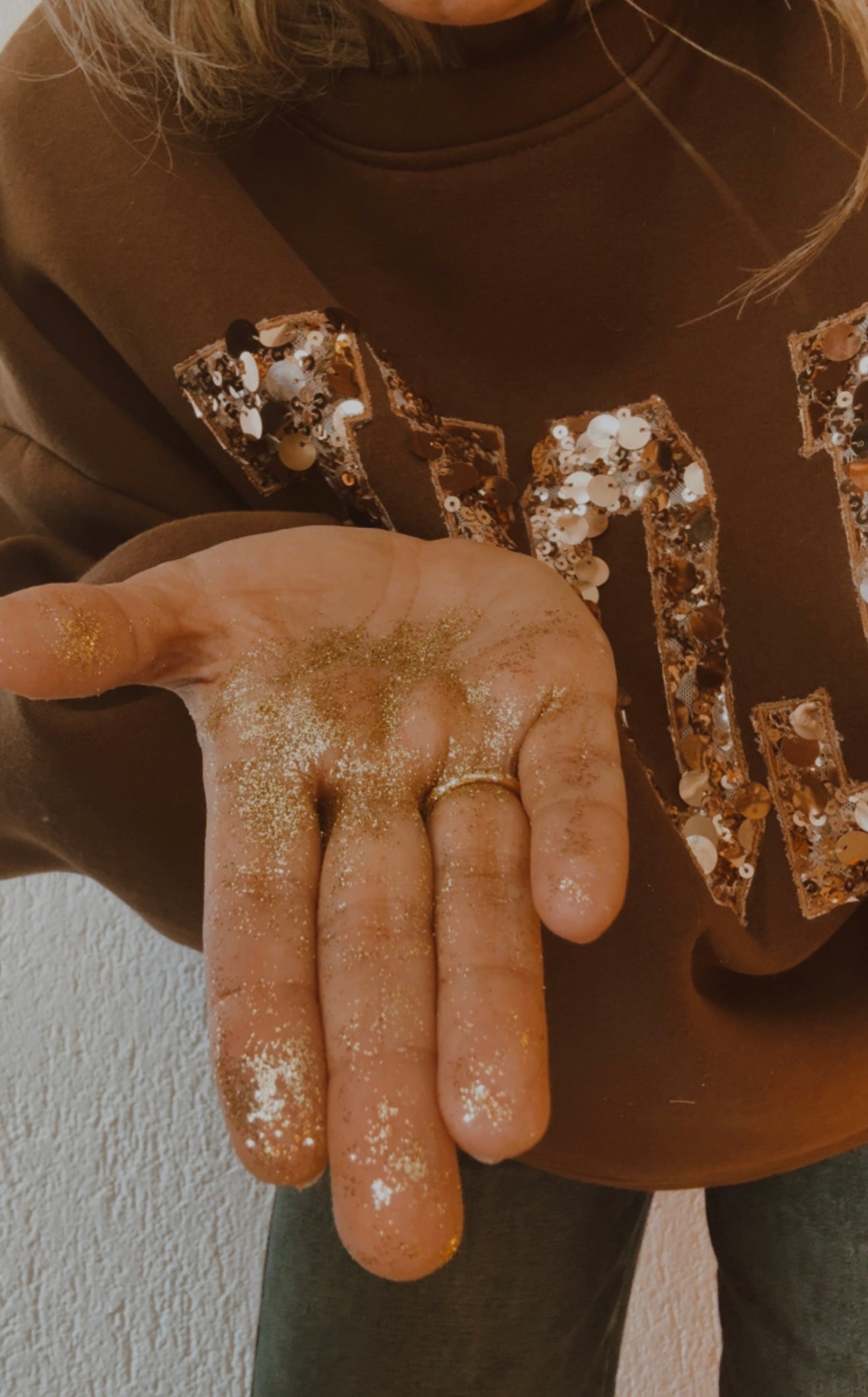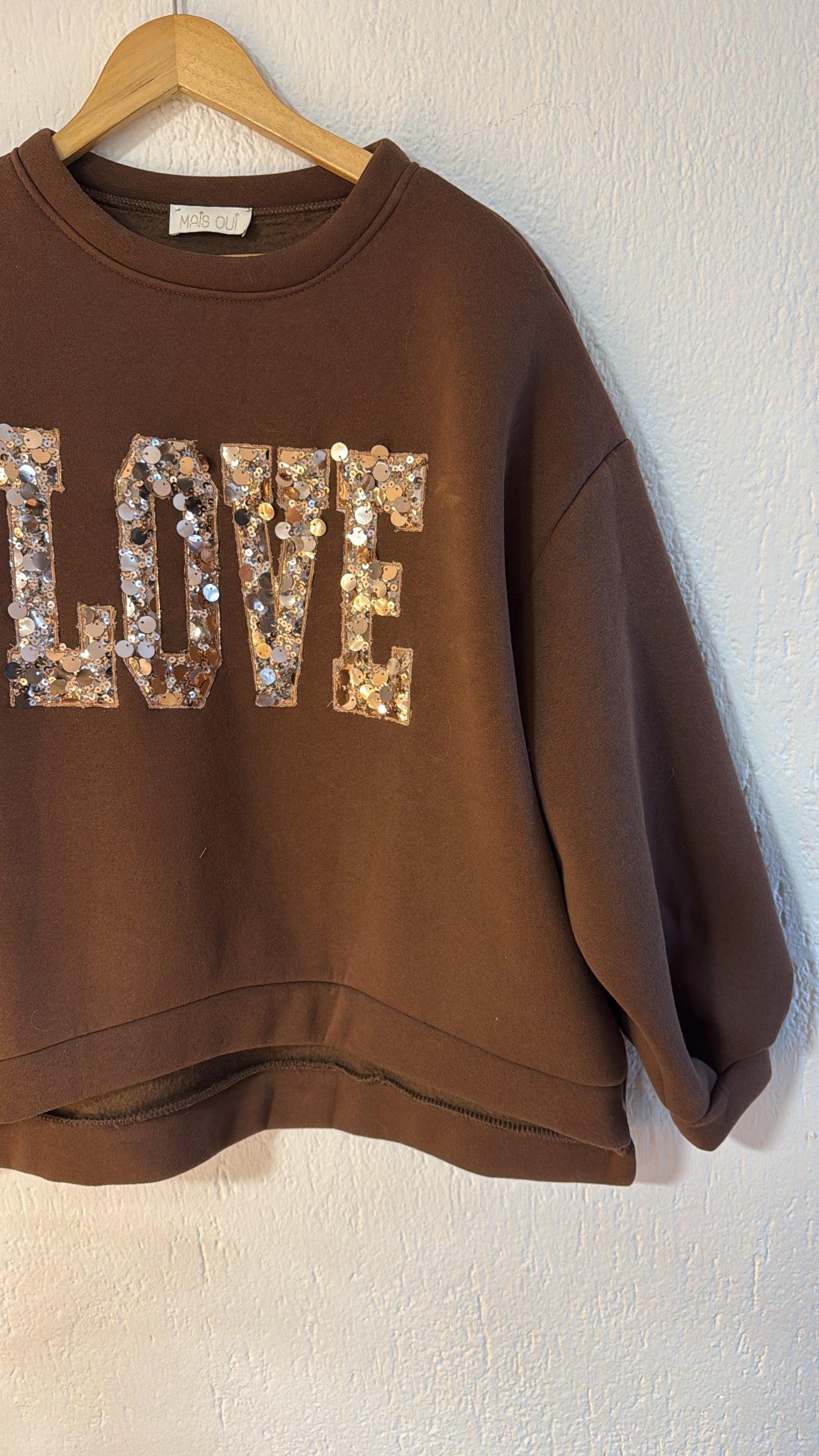 Realizzata in un caldo beige neutro, presenta la scritta LOVE in grandi lettere ricamate con paillettes scintillanti chr aggiungono un tocco glamour e luminoso. Il taglio morbido con spalle scese e l’orlo asimmetrico – più corto davanti e leggermente più lungo dietro – dona un look casual ma ricercato, perfetto da abbinare sia a jeans che a leggings.
