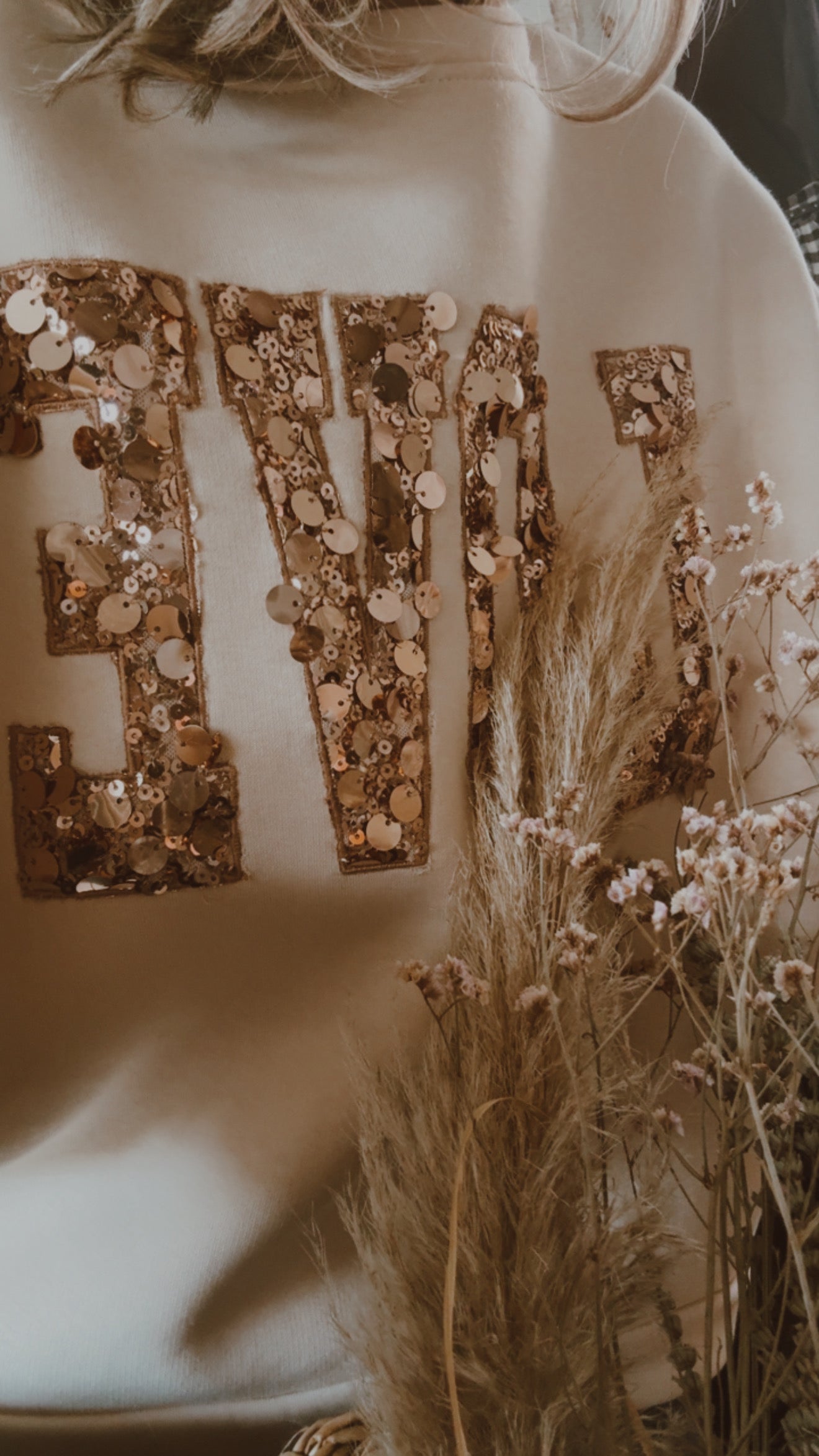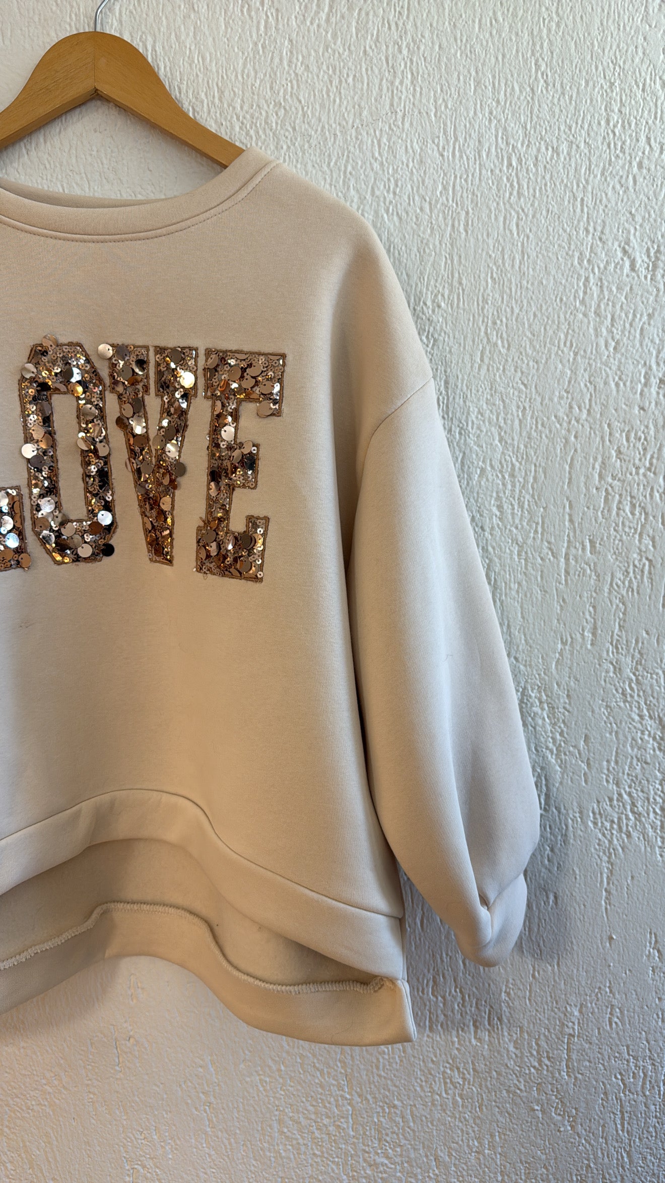 Realizzata in un caldo beige neutro, presenta la scritta LOVE in grandi lettere ricamate con paillettes scintillanti chr aggiungono un tocco glamour e luminoso. Il taglio morbido con spalle scese e l’orlo asimmetrico – più corto davanti e leggermente più lungo dietro – dona un look casual ma ricercato, perfetto da abbinare sia a jeans che a leggings.