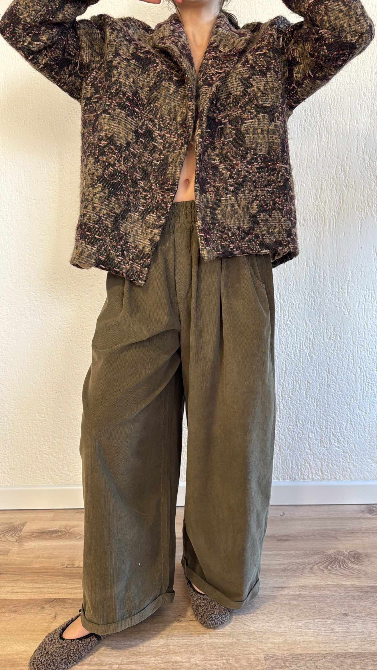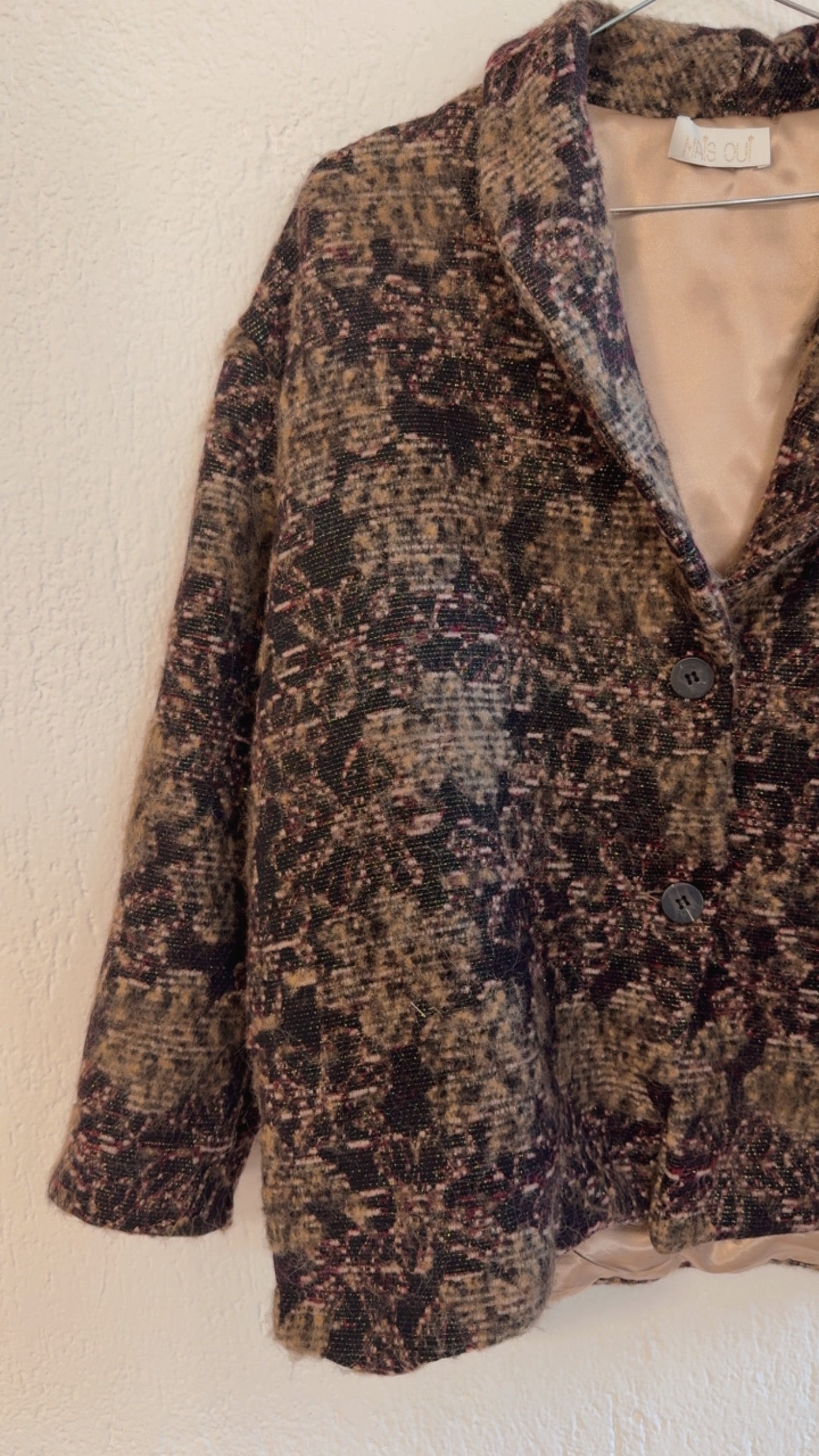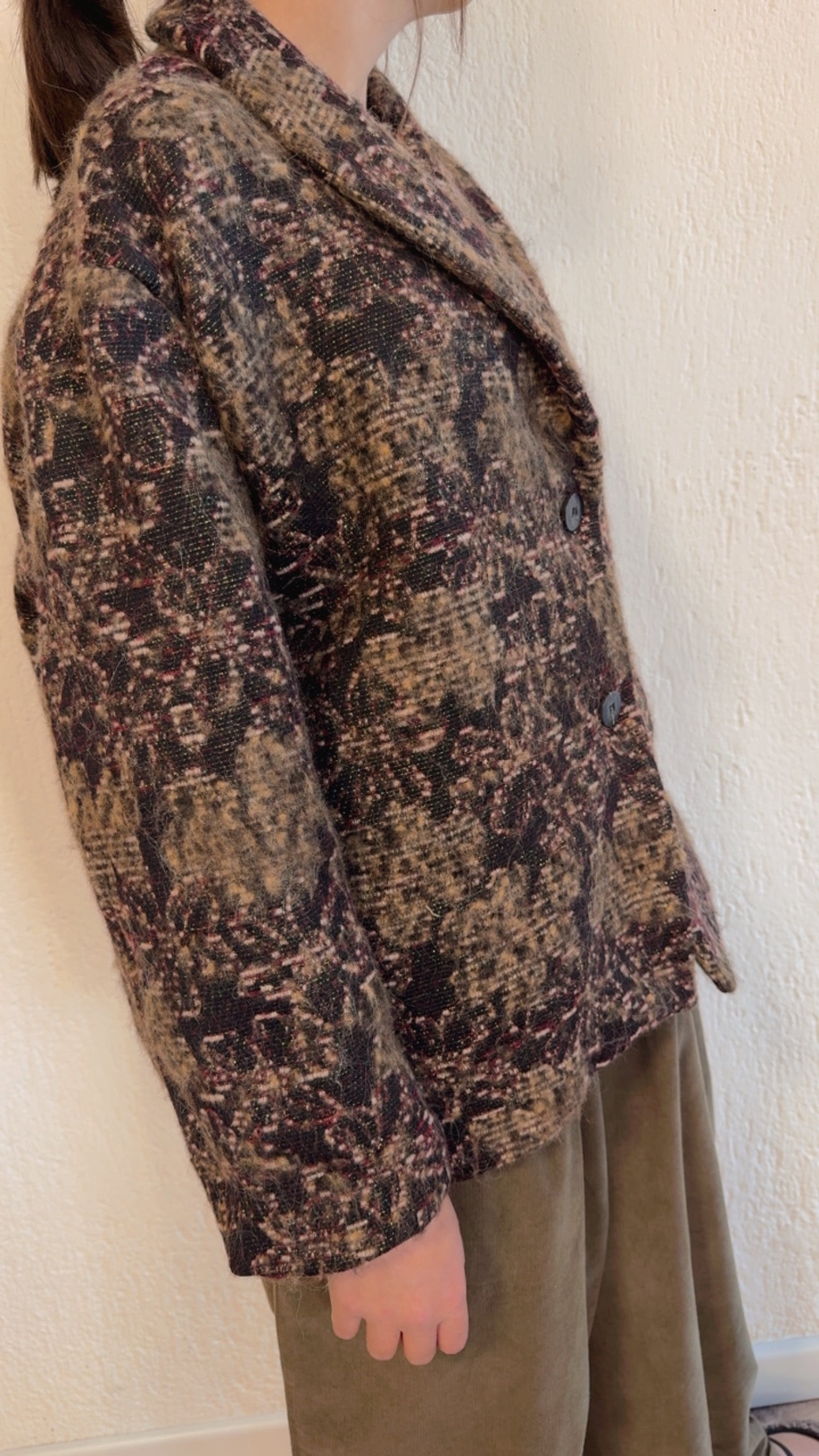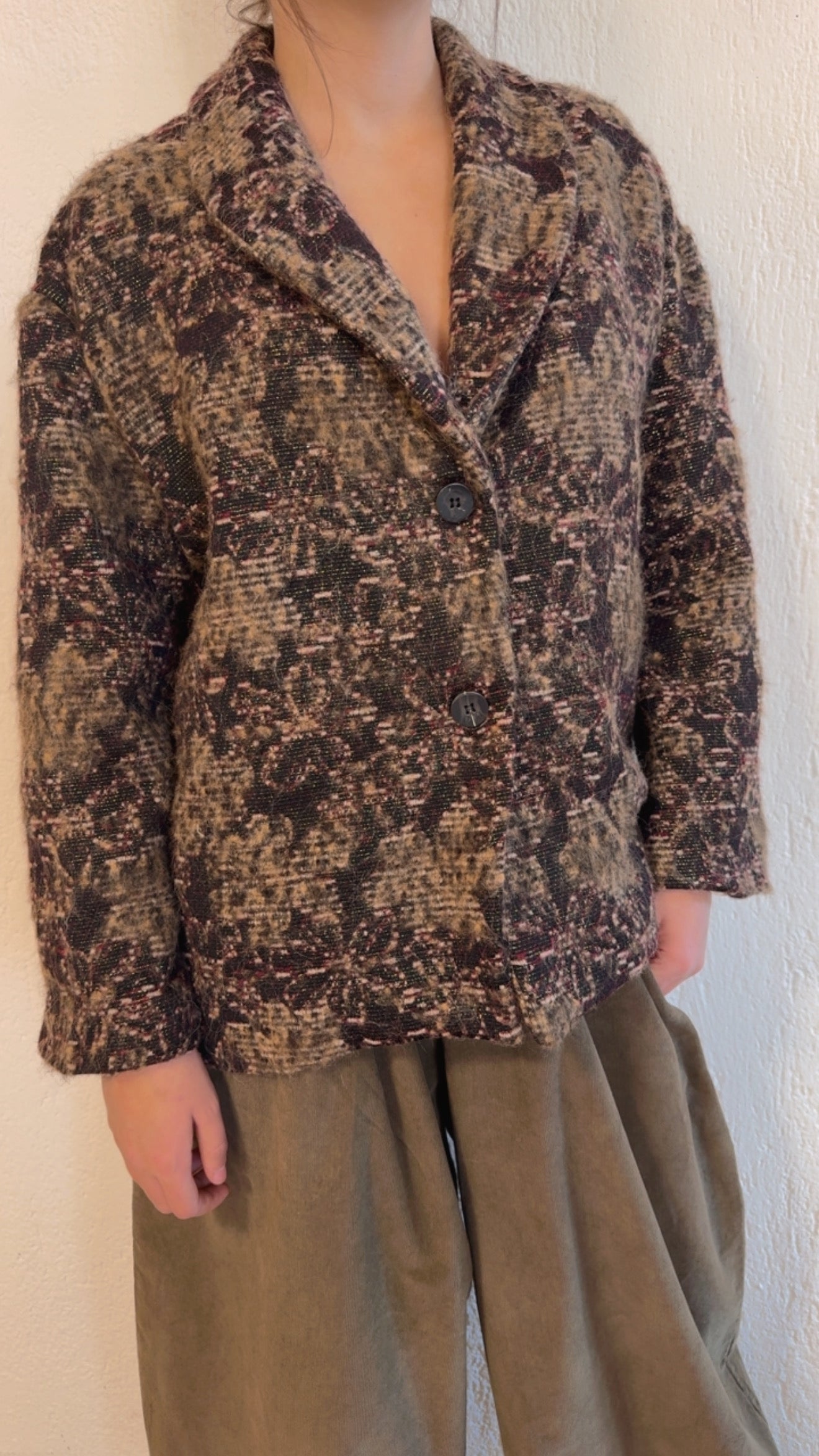 Strutturata in tessuto mélange con motivo sfumato impreziosita da sottili fili di lurex che catturano la luce.