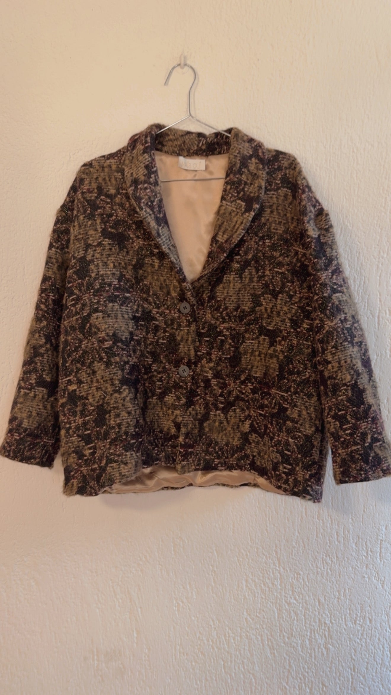 Dalla linea leggermente over, collo a revers e chiusura con bottone centrale.