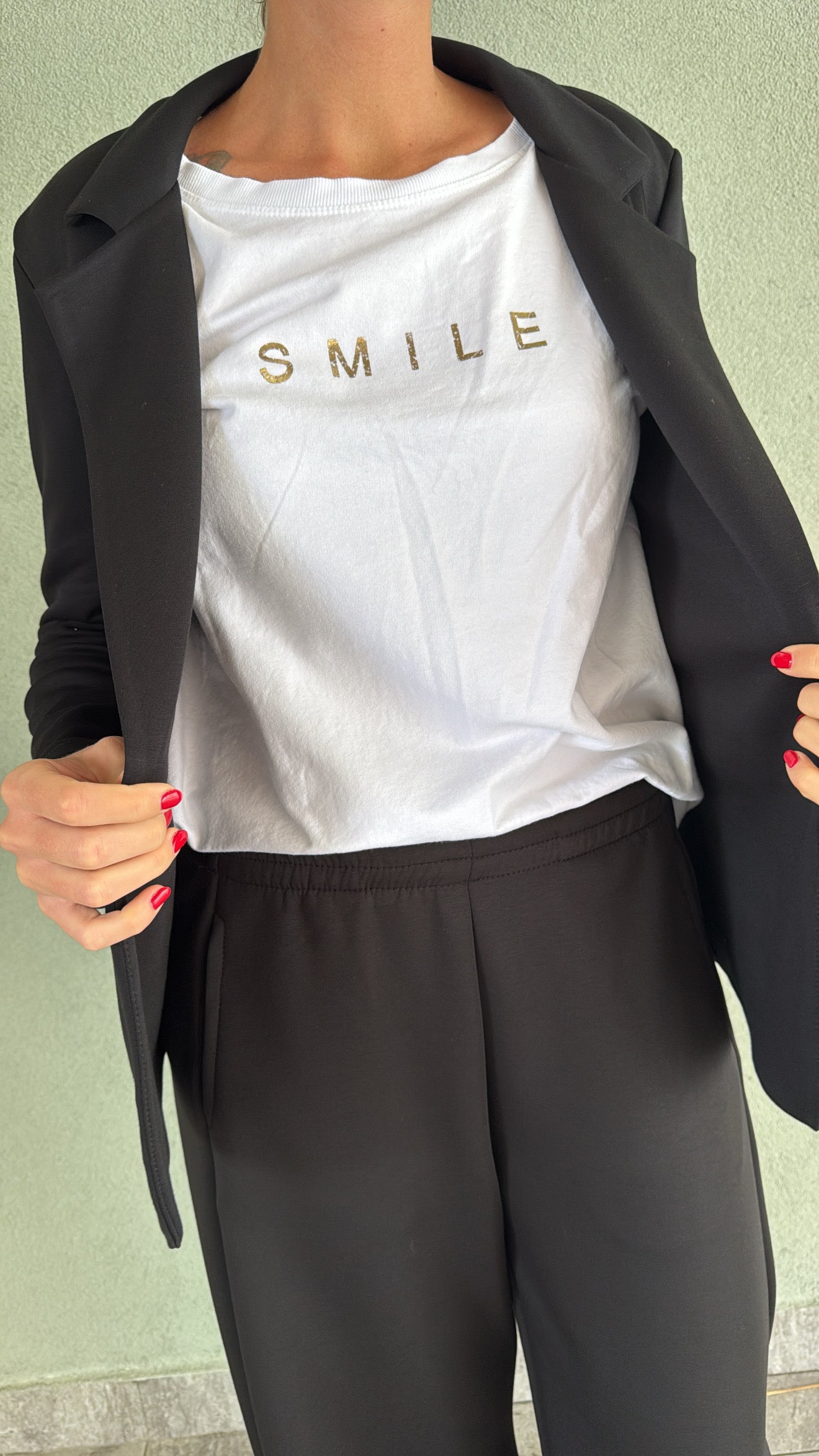 Giacca monobottone in tessuto elasticizzato; pantalone con elastico in vita, tasche laterali, gamba dritta leggermente a stringere sul fondo.