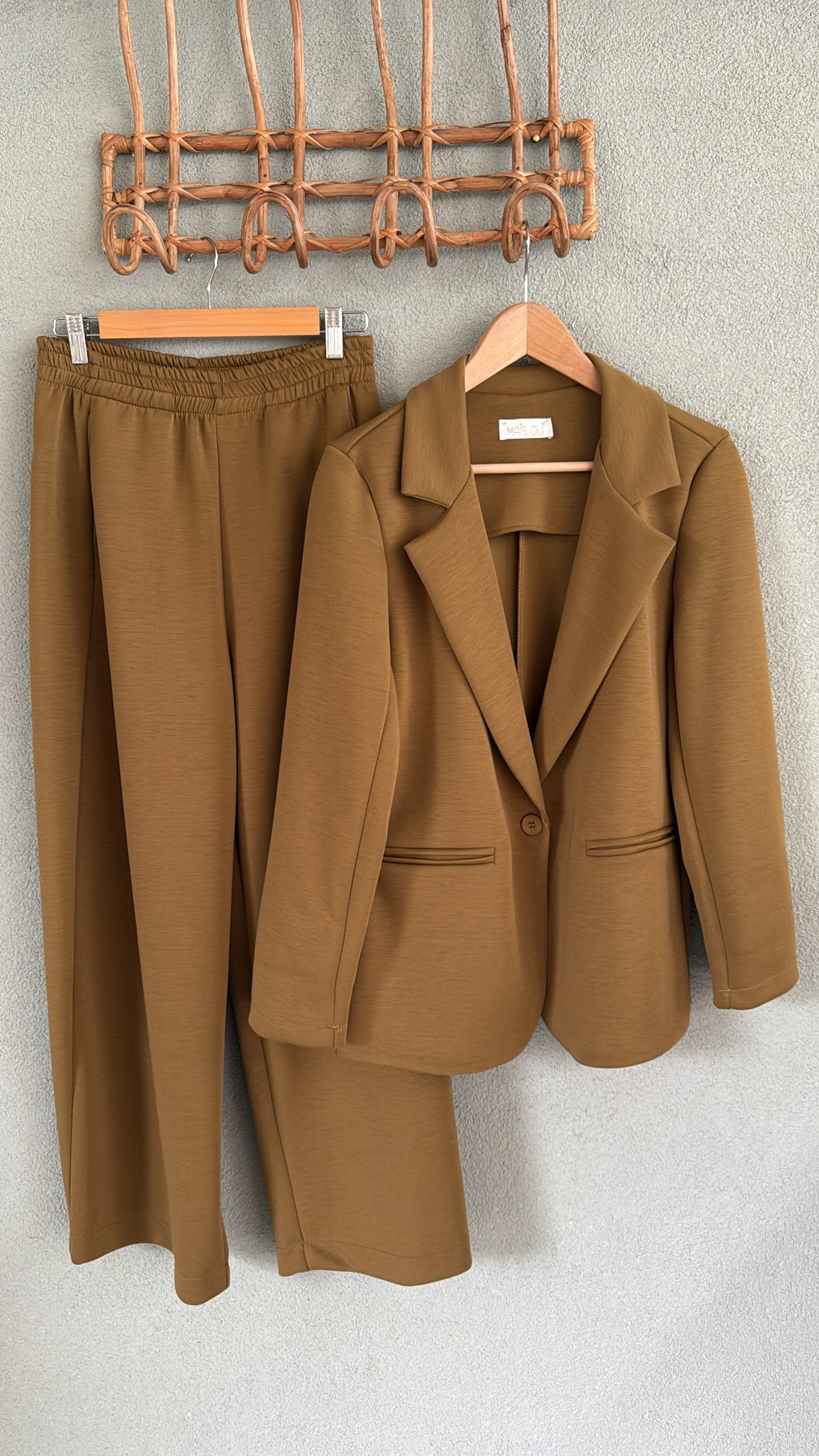 Giacca monobottone in tessuto elasticizzato; pantalone con elastico in vita, tasche laterali, gamba dritta leggermente a stringere sul fondo.