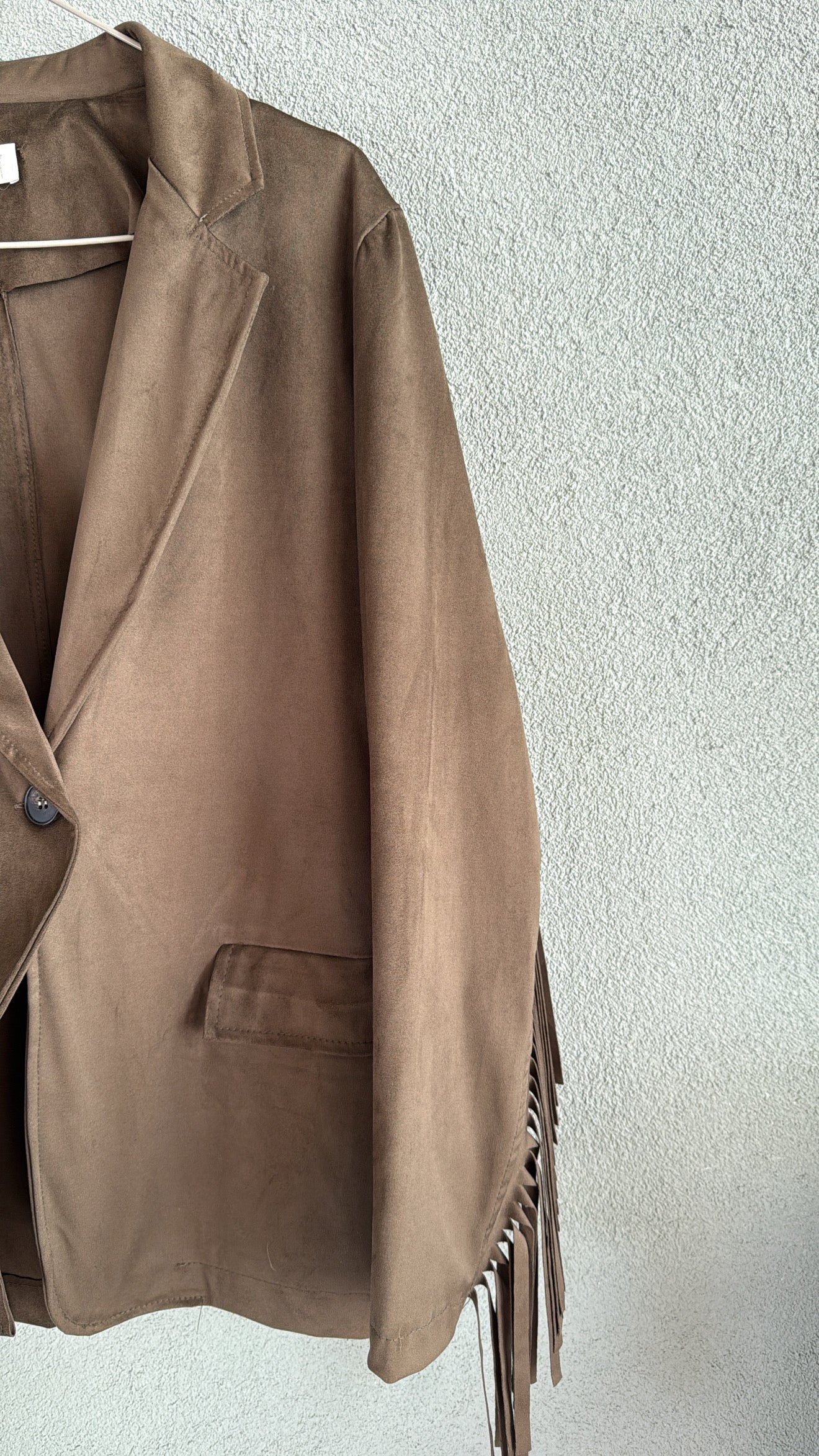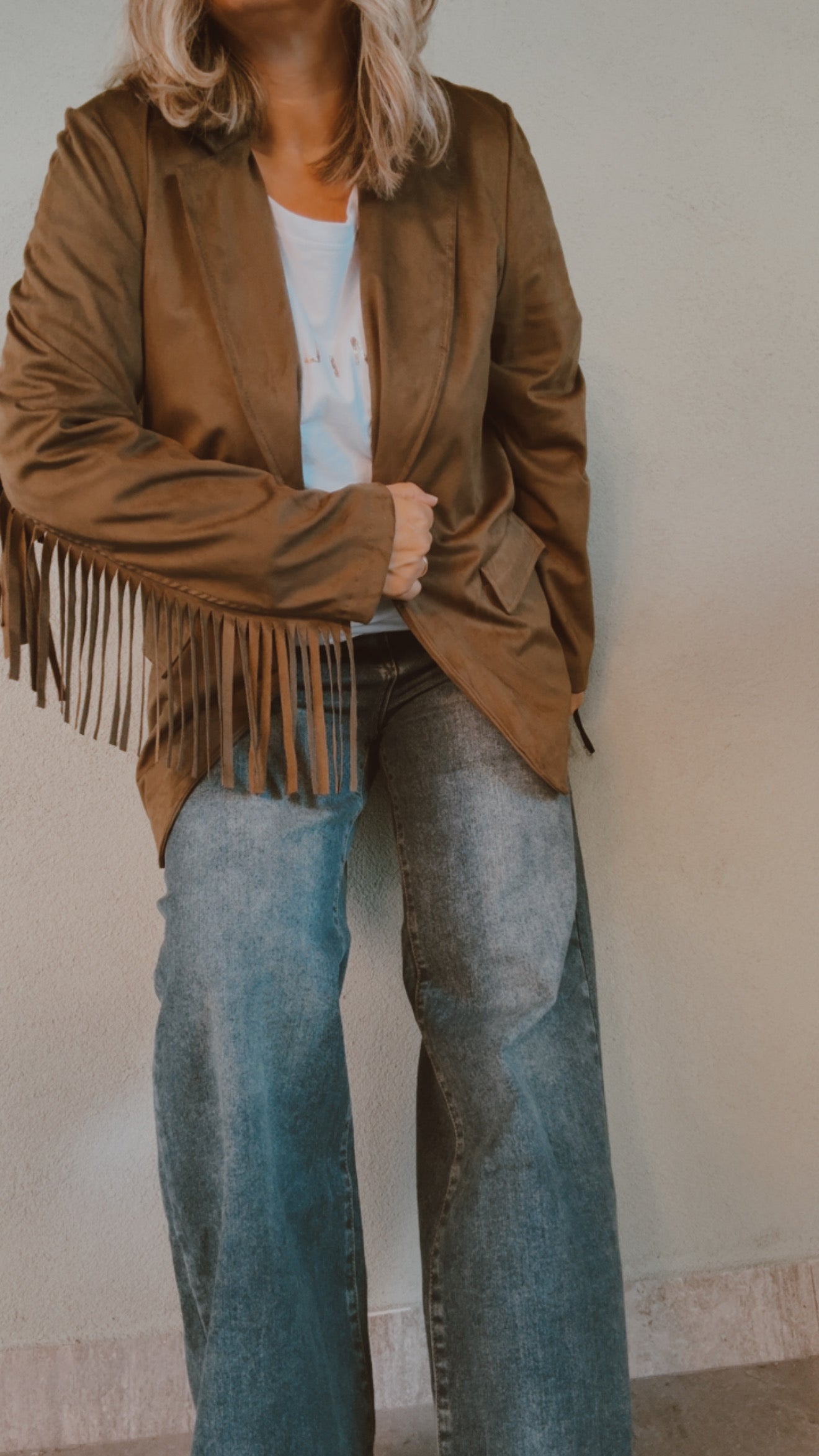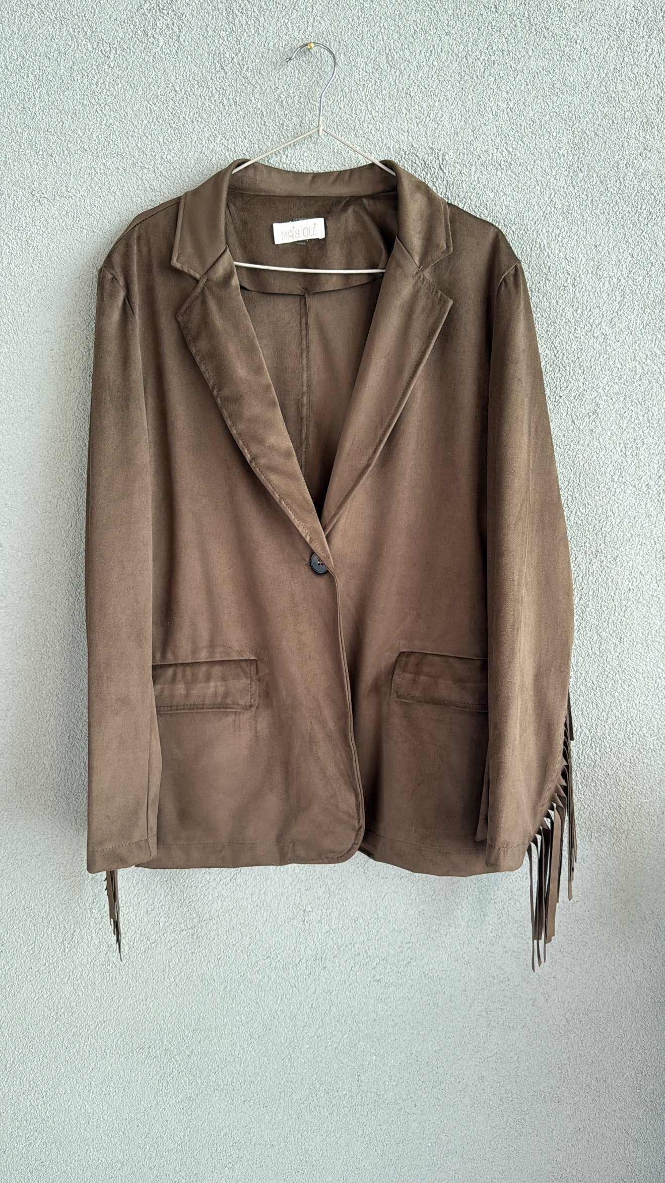 Questa giacca effetto scamosciato, nel raffinato tono del verde oliva, reinterpreta il blazer classico con un tocco boho grazie alle frange lungo le maniche. Morbida al tatto e dal taglio fluido, è perfetta per aggiungere personalità anche ai look più semplici.