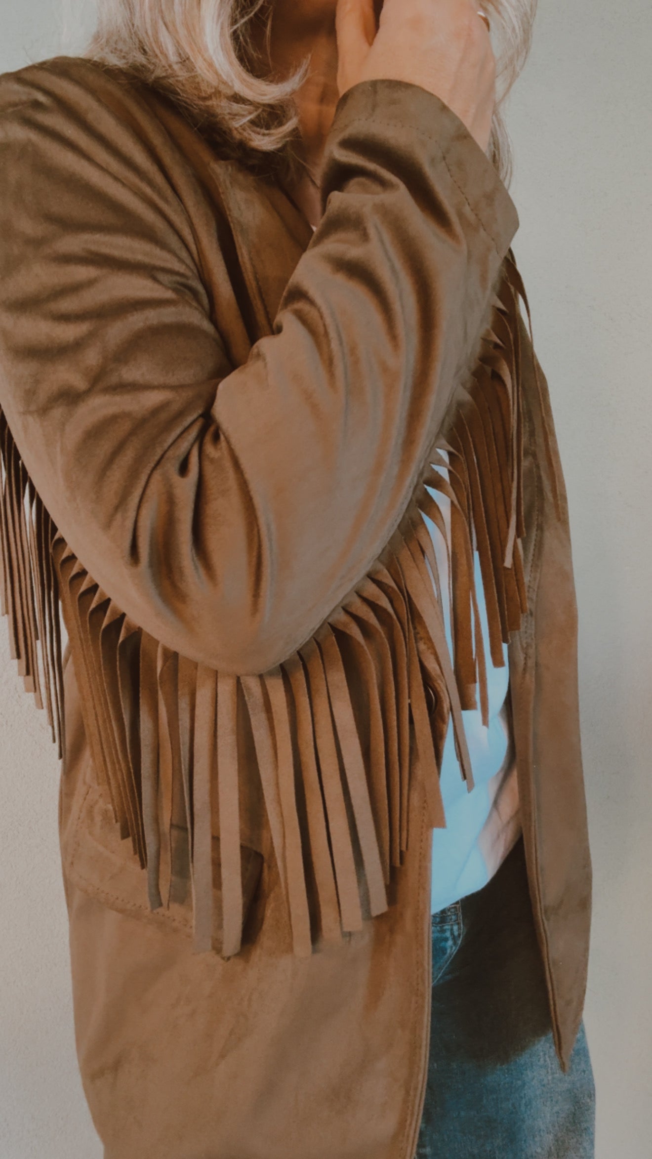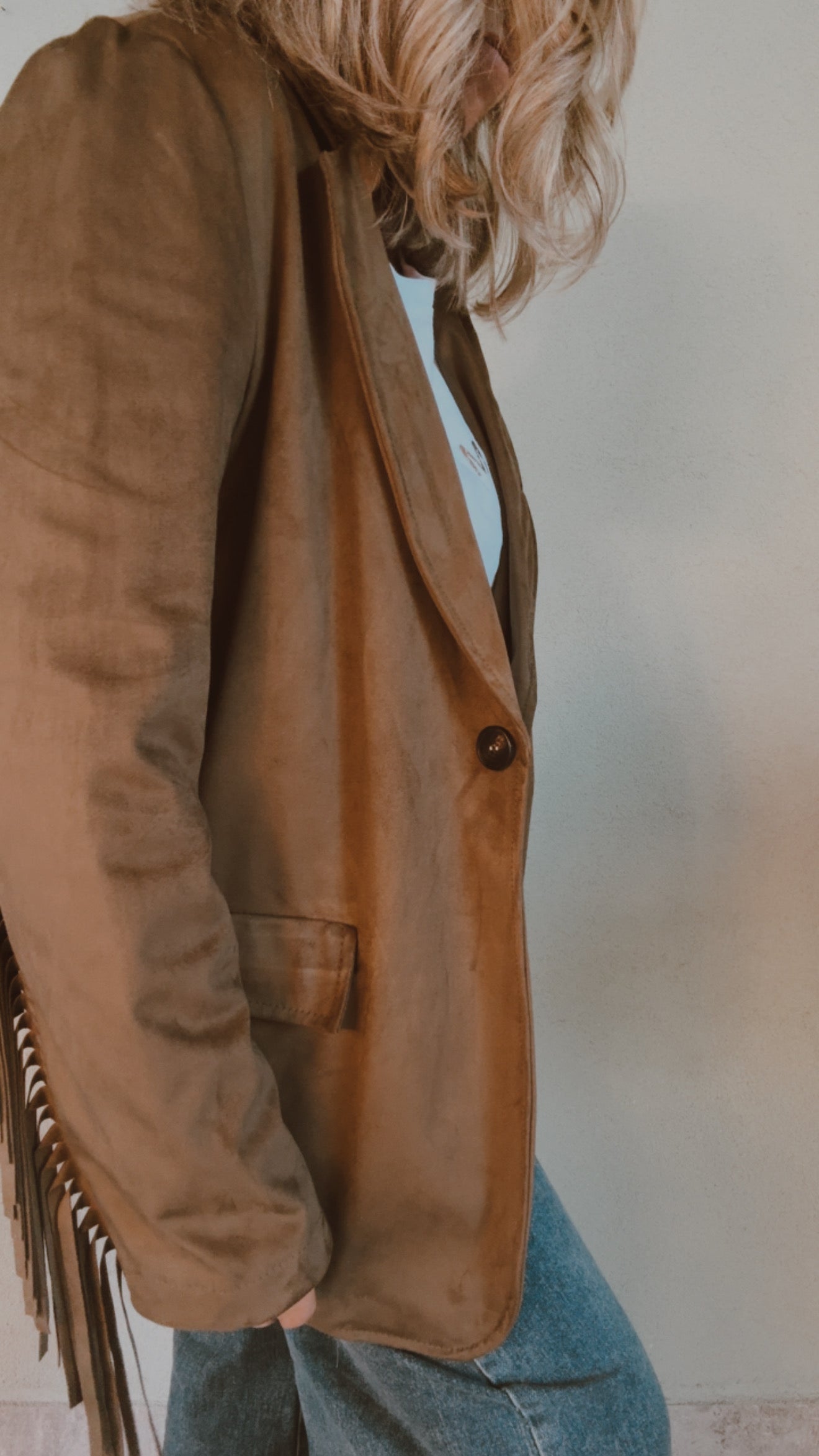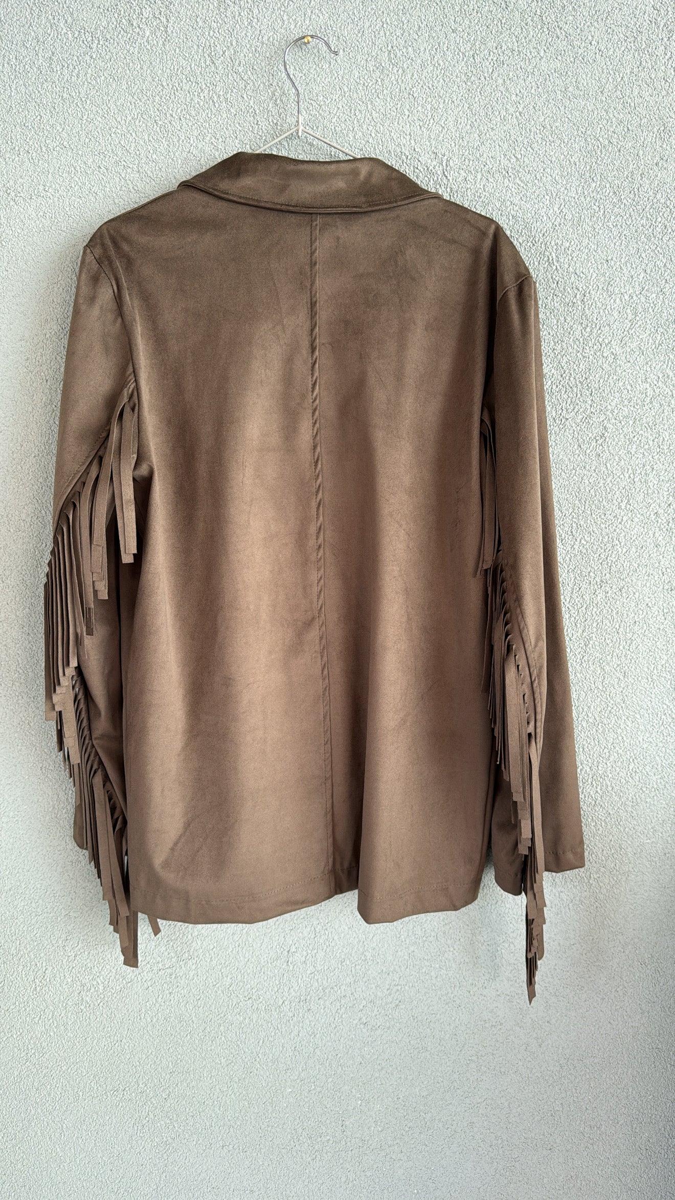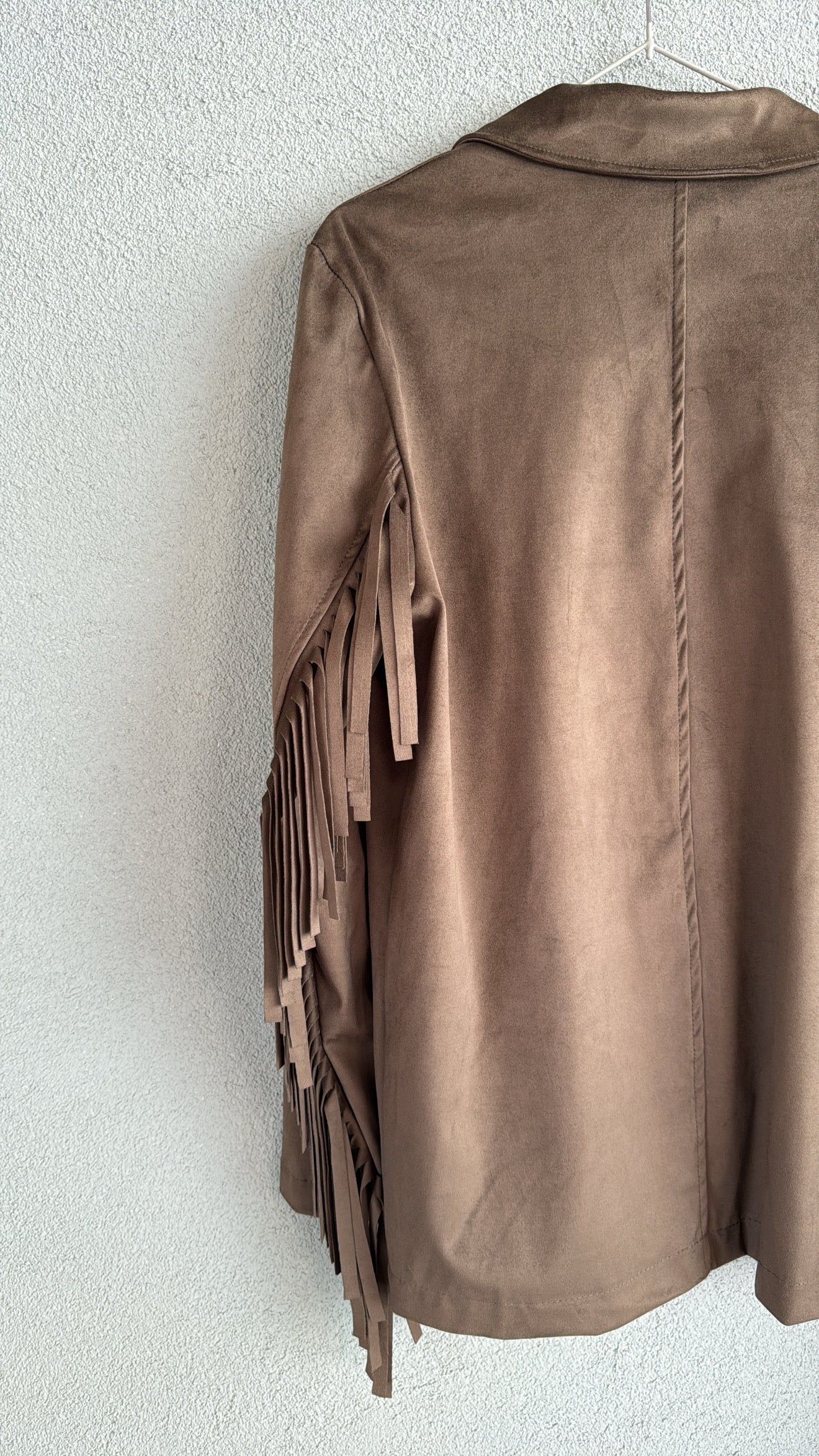 Questa giacca effetto scamosciato, nel raffinato tono del verde oliva, reinterpreta il blazer classico con un tocco boho grazie alle frange lungo le maniche. Morbida al tatto e dal taglio fluido, è perfetta per aggiungere personalità anche ai look più semplici.