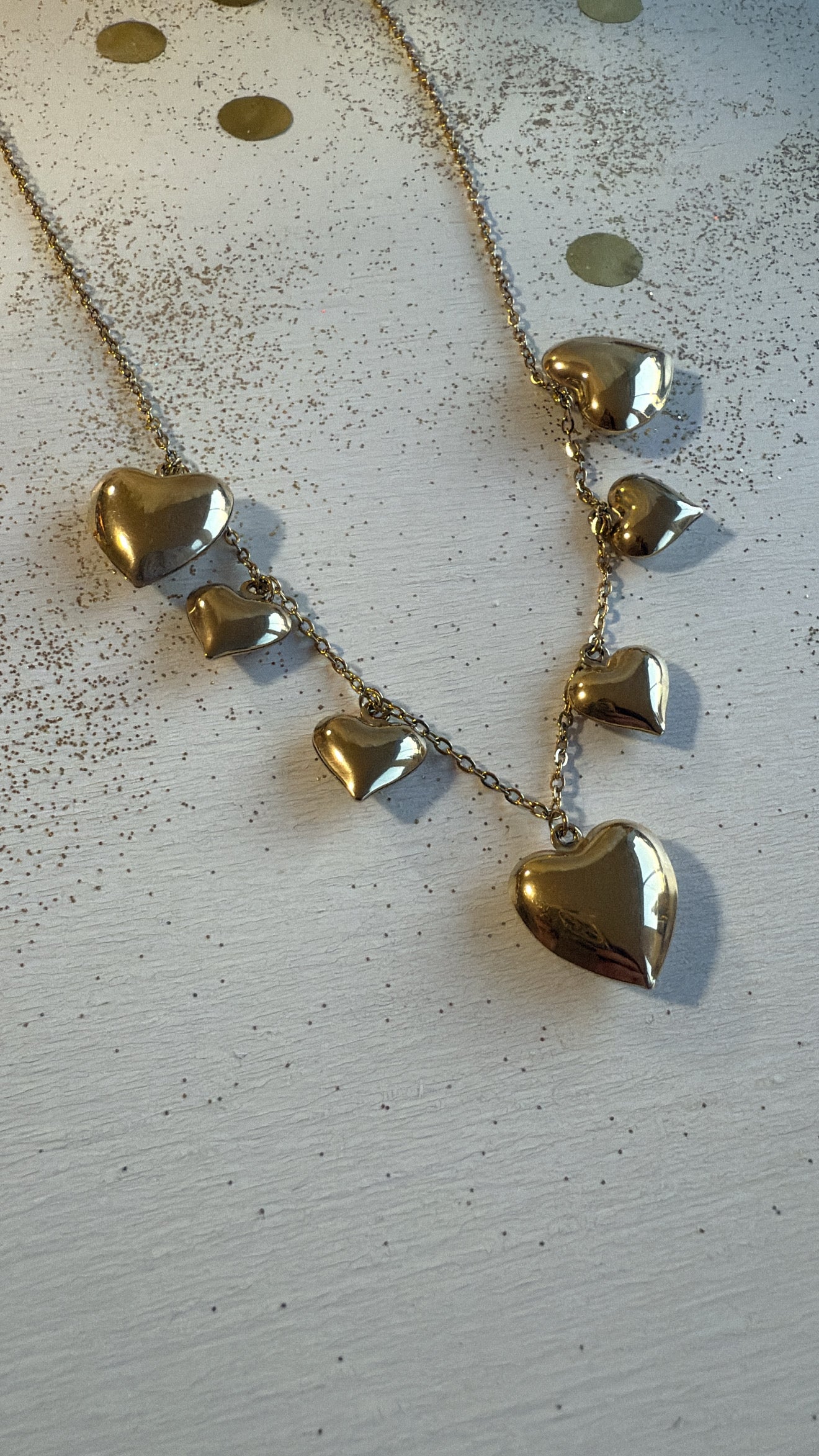 Girocollo con sette cuori a sonaglio di diverse dimensioni.