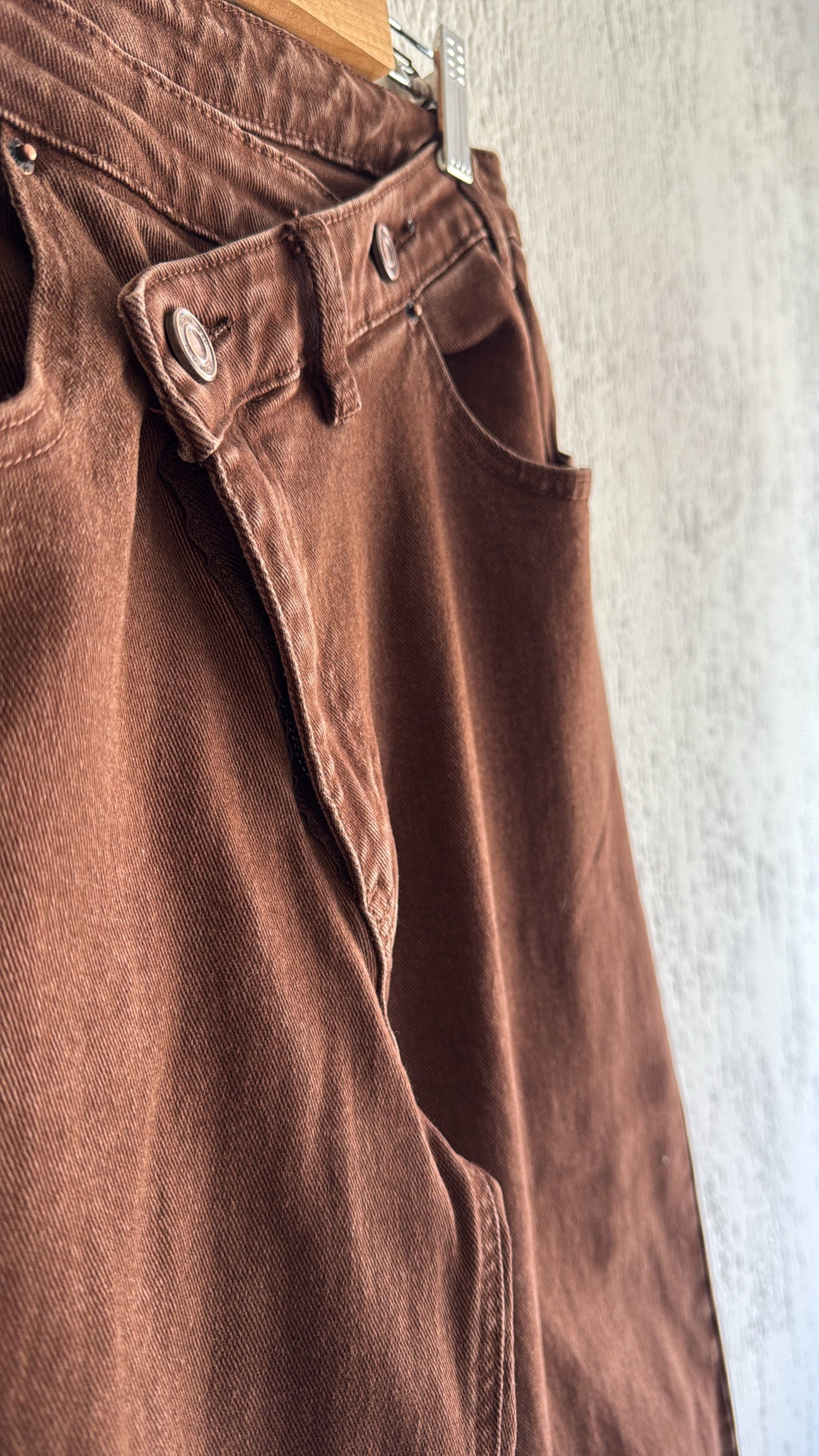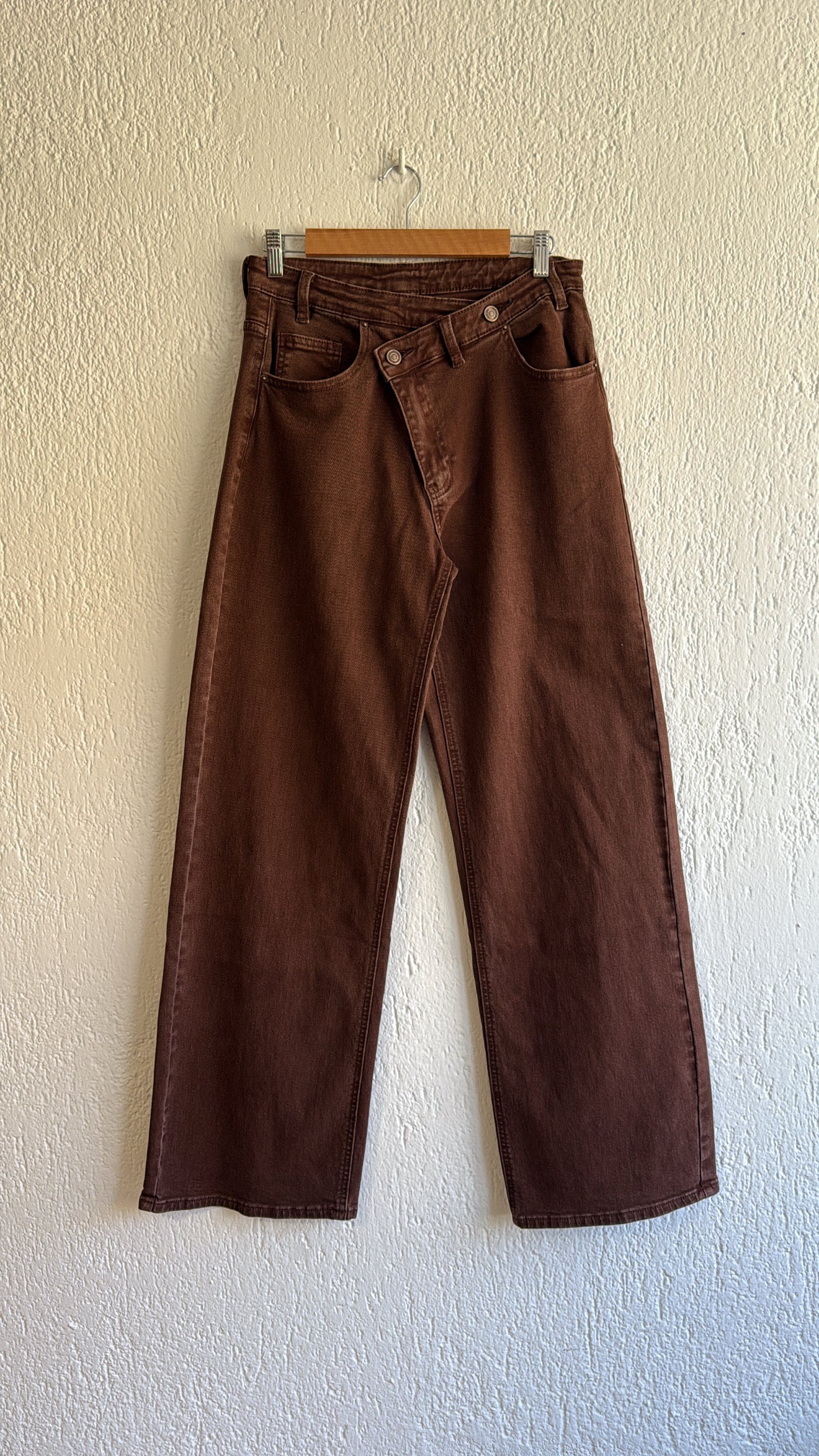 Questo jeans reinterpreta il denim in chiave contemporanea con la sua chiusura incrociata asimmetrica e la linea dritta ampia, che slancia e dona carattere.
