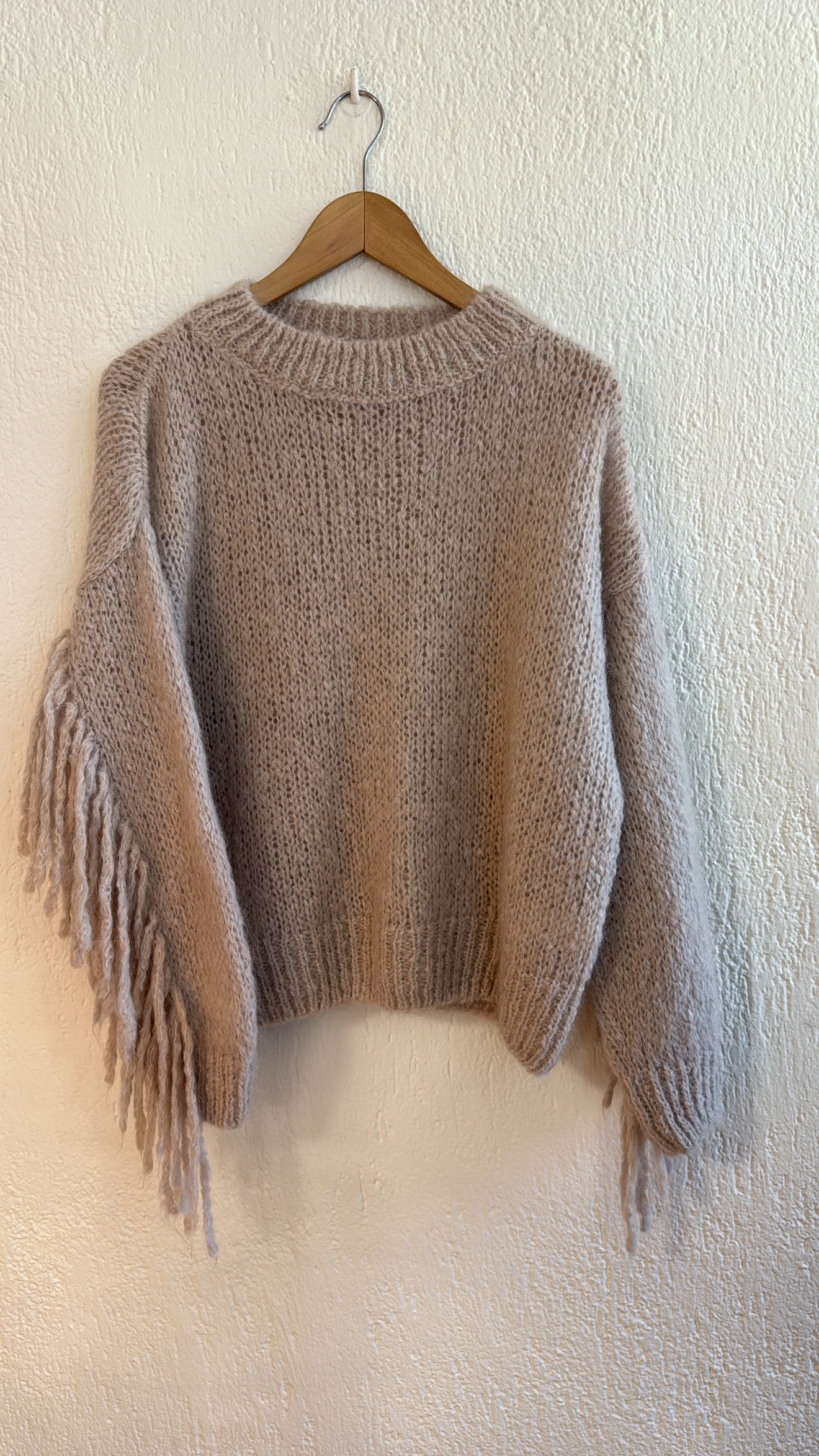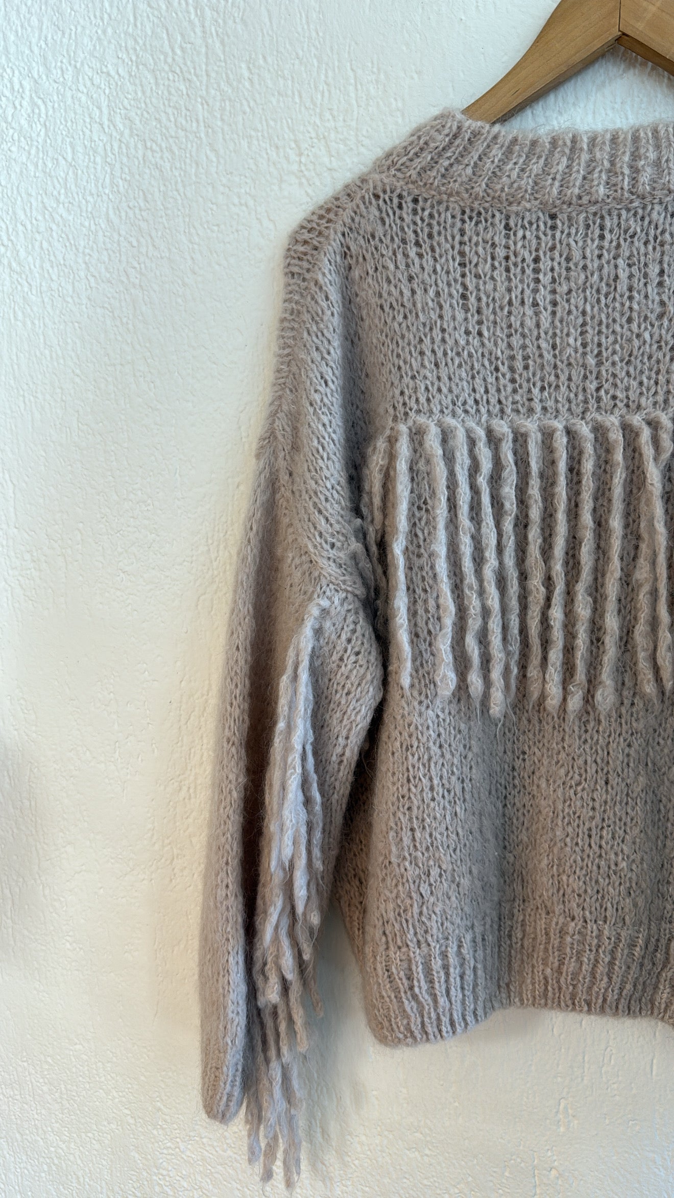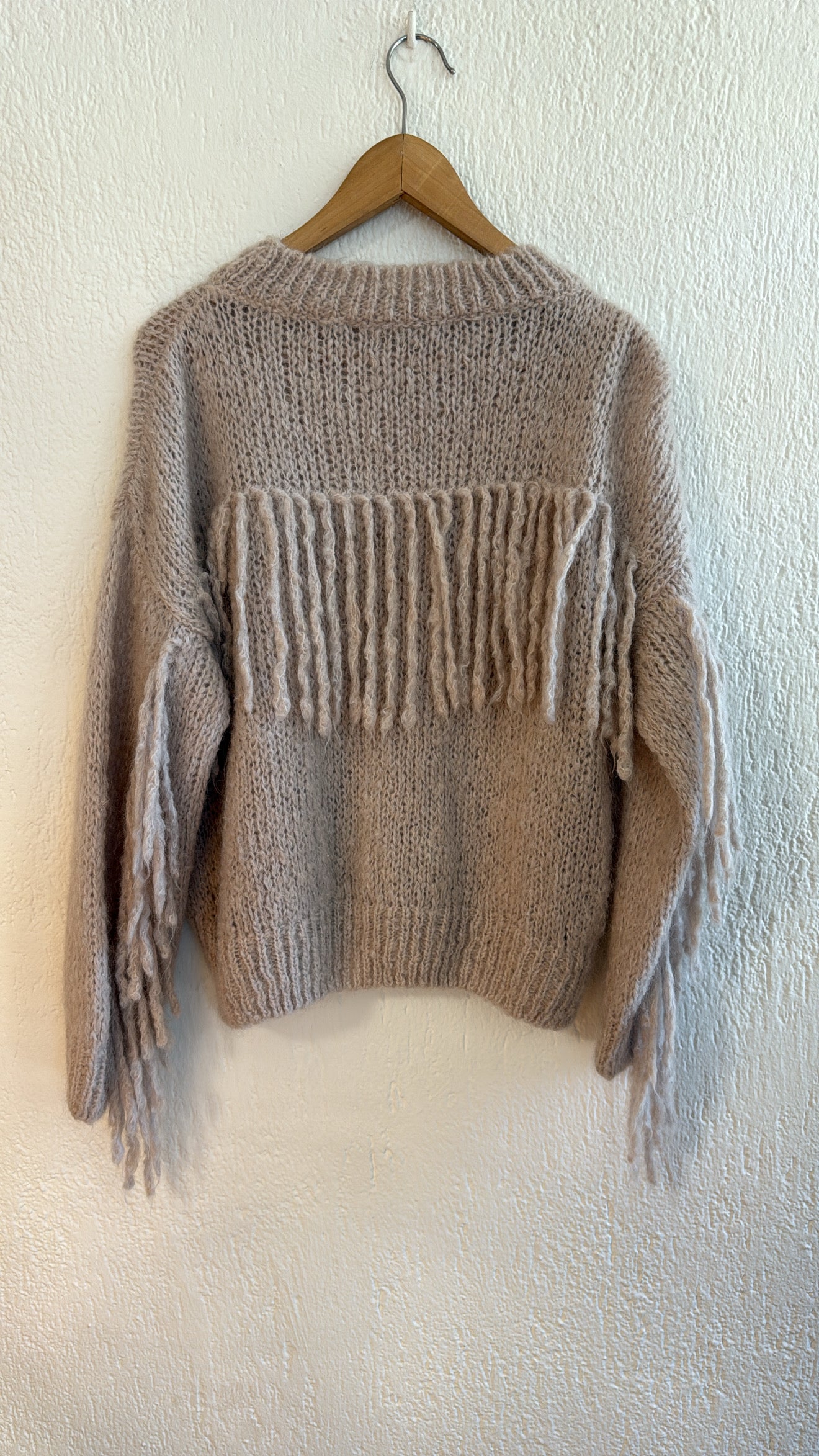 In morbido filato con dettaglio frange sul retro e sulle maniche che dona movimento e carattere, trasformandolo in un pezzo unico e contemporaneo.